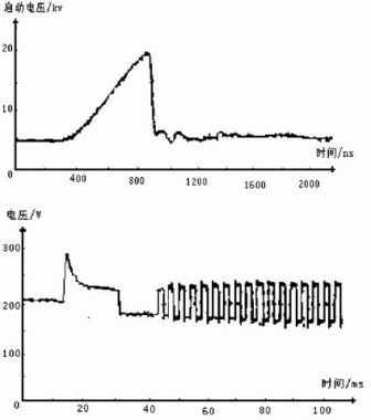 圖5采用3倍壓整流電路,放電管的額定擊穿電壓為600V ,高壓包的匝數(shù)比1∶50 ,放電管擊穿電壓為600V。實(shí)驗(yàn)波形見圖6。