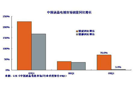 GfK中國(guó)發(fā)布的《液晶電視產(chǎn)業(yè)市場(chǎng)季度報(bào)告(09Q1)》顯示:2009年1季度,中國(guó)液晶電視市場(chǎng)出現(xiàn)了反彈,銷量達(dá)到476萬(wàn)臺(tái),比2008年1季度增長(zhǎng)了約70%。