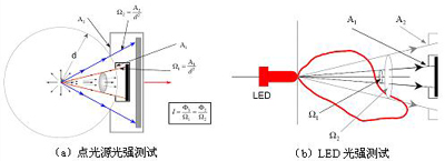 如圖4所示,點光源光強在空間各方向均勻分布,在不同距離處用不同接收孔徑的探測器接收得到的測試結(jié)果都不會改變,但是LED由于其光強分布的不一致使得測試結(jié)果隨測試距離和探測器孔徑變化。因此,CIE-127提出了兩種推薦測試條件使得各LED在同一條件下進行光強測試與評價,目前CIE-127條件已經(jīng)被各LED制造商和檢測機構(gòu)引用。
