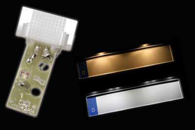 如圖2所示,光線可以從安裝在小尺寸PCB板上的表面貼裝LED器件發(fā)出,并使用限流電阻和反極性保護二極管。光線被直接照到簡單或精心設計的導光管上,這是約束光線的極其簡單方法。比較常用的方法是用適當?shù)?ldquo;透鏡”或投光面體,安裝方法也經常是在轎車內部把它夾進車門嵌板開口的地方、中央控制臺或儀表盤上。