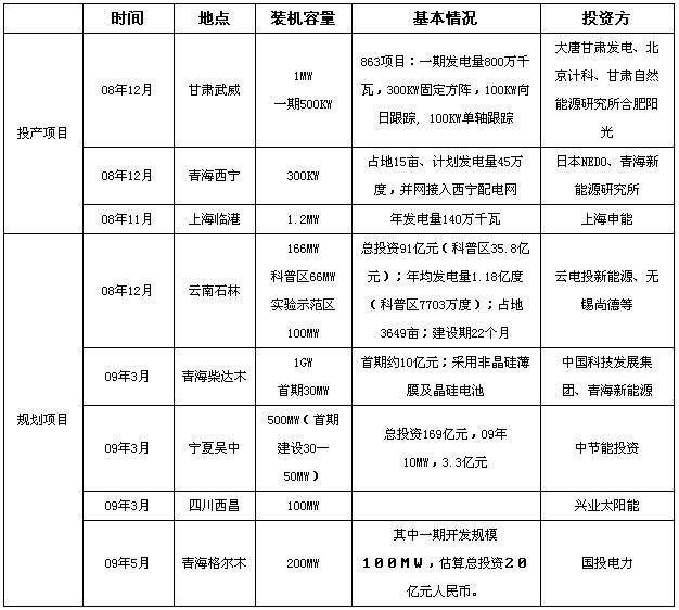 受國家政策的導(dǎo)向,從2008年底到2009年上半年,全國上馬了多個大型并網(wǎng)電站項目,如青海柴達木的1GW光伏電站項目、青海格爾木的 200MW光伏電站項目、寧夏吳中的500MW光伏電站項目等,盡管目前國家只批準了三個光伏電站項目包括上海崇明島1MW項目、255千瓦的內(nèi)蒙古鄂爾多斯項目和甘肅敦煌的100MW項目,而以上新上馬的項目還有待國家的批復(fù)。