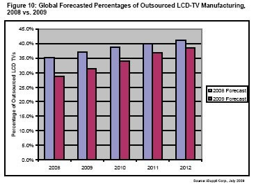 估計(jì)這一趨勢在2009年還將繼續(xù),外包的LCD-TV比預(yù)期的少5.6%。到2010、2011和2012年,外包量將比先前預(yù)測的少4.8、3.2和2.6個(gè)百分點(diǎn)。