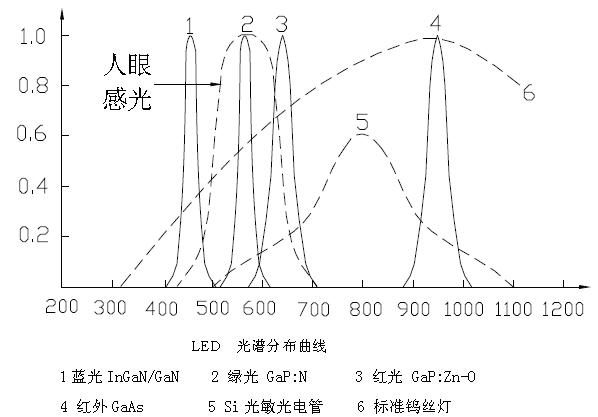 LED 的光譜分布與制備所用化合物半導(dǎo)體種類、性質(zhì)及pn結(jié)結(jié)構(gòu)(外延層厚度、摻雜雜質(zhì))等有關(guān),而與器件的幾何形狀、封裝方式無關(guān)。