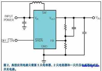LinearTechnology公司推出的LTC3459是解決這些應(yīng)用問題的一系列升壓轉(zhuǎn)換器中的一個例子。LTC3459這種器件有一種突發(fā)模式,用以在輕載電流下保持轉(zhuǎn)換器的效率。它還具有浪涌電流限制、短路保護和關(guān)機期間負載隔離等功能。盡管具有這些功能,但典型的應(yīng)用電路只要求在開關(guān)電路中有三只電容器、兩只電阻器和一個升壓電感器(圖2)。Wells說,因為“轉(zhuǎn)換器工作時的峰值電流小約75mA,所以一個0805小型電感器……能輕易達到與一個集成電荷泵相同的占用電路板面積。”