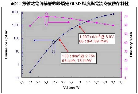 根據(jù)實(shí)驗(yàn)結(jié)果顯示,65cd/A與80lm/W(在100cd/m2,2.6V)的綠色磷光OLED,經(jīng)過(guò)doping后的載電荷子傳輸層(如下圖所示),它的內(nèi)部量子效率(quantumefficiency)可以達(dá)到接近100%(相較之下Out-coupling系數(shù)只有20%),而且可以獲得較佳的亮度,運(yùn)作電壓更接近熱力極限。
