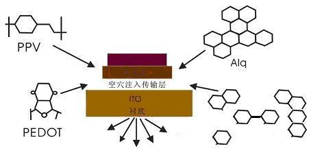 OLED的發(fā)光機(jī)理和過(guò)程是從陰、陽(yáng)兩極分別注入電子和空穴,被注入的電子和空穴在有機(jī)層內(nèi)傳輸,并在發(fā)光層內(nèi)復(fù)合,從而激發(fā)發(fā)光層分子產(chǎn)生單態(tài)激子,單態(tài)激子輻射衰減而發(fā)光。[page]