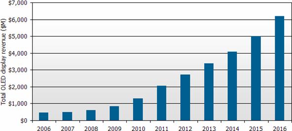 “根據(jù)DisplaySearch最新發(fā)表季度OLED(有機發(fā)光二極管顯示器)出貨報告指出,第二季全球OLED出貨金額創(chuàng)新高達1億9千2百萬美元,較上一季成長32%,與去年同期相比成長22%。DisplaySearch預測全球OLED產(chǎn)值將從2008年6億美元,按每年33%復合成長率成長,估計到了2016年整體產(chǎn)值將達到62億美元;其中手機主屏仍是最主要的應用,2016年出貨金額估計為30億美元,同時OLED TV產(chǎn)值將達20億美元,成為OLED第二大應用產(chǎn)品。