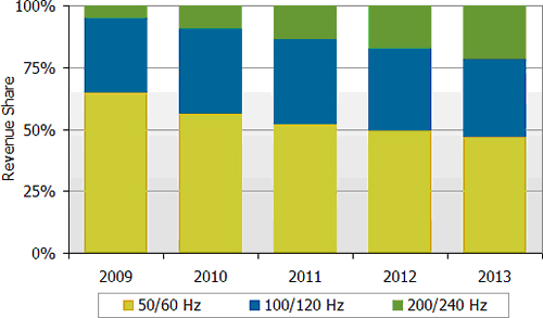 根據(jù)DisplaySearch最新一季全球電視出貨報(bào)告中指出,對(duì)液晶電視制造商而言,轉(zhuǎn)移并制造采用高倍頻技術(shù)電視以提高產(chǎn)品價(jià)值非常重要,而對(duì)零售商來說,提高液晶電視產(chǎn)品的便利性與高畫質(zhì)亦是重要課題。預(yù)計(jì)2009年120Hz液晶電視出貨金額將占全球液晶電視出貨總金額的31%,而240Hz 液晶電視將占5%;到了2013年,120Hz液晶電視出貨金額占全球液晶電視出貨總金額的比重將成長(zhǎng)到32%,而240Hz液晶電視將接近22%。