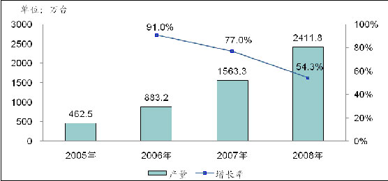 隨著傳統(tǒng)CRT彩電的逐漸被取代,液晶電視的普及已經(jīng)成為不可逆轉(zhuǎn)的趨勢,并且普及的速度在不斷加快。中國作為全球最大的彩電制造基地和彩電消費市場,在彩電工業(yè)的轉(zhuǎn)型過程中,液晶電視的產(chǎn)量也出現(xiàn)了爆發(fā)式的增長。根據(jù)賽迪顧問統(tǒng)計,2005年-2008年,中國液晶電視產(chǎn)量的年均復(fù)合增長率高達(dá)73.4%,2008年產(chǎn)量達(dá)到2411.8萬臺。