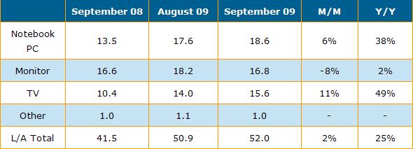 根據(jù)DisplaySearch最新9月份液晶面板出貨調(diào)查數(shù)據(jù)顯示,2009年9月大尺寸(指10寸及10寸以上)液晶面板出貨達5千2百萬片,較上月出貨上升2%并較去年同期上升25%,突破單月份大尺寸液晶面板出貨的紀錄。大尺寸(指10寸及10寸以上)液晶面板在2009年9月份的出貨營收達68億美元,比上月成長6%并較去年同期成長15%。