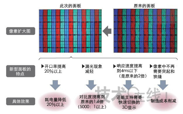 與原來相比,此次的液晶面板具有四大特點(diǎn)。即:耗電量低、對(duì)比度高、響應(yīng)速度快、制造成本低。