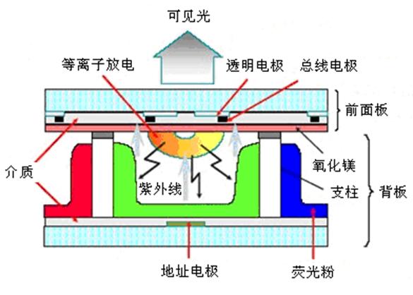 PDP是Plasma Display Panel的簡寫,也就是等離子體顯示器。PDP顯示器的工作原理是,通過加電,讓等離子汽體(一般為惰性氣體)在強(qiáng)電場中放電產(chǎn)生紫外線,然后通過紫外線激發(fā)熒光粉發(fā)光,PDP顯示器的工作原理如圖5所示,其結(jié)構(gòu)如圖6所示。