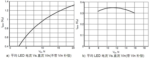 圖2:不帶Vin補(bǔ)償及帶Vin補(bǔ)償時(shí)的平均LED電流vs. Vin曲線