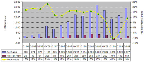 在2009年上半年,生產(chǎn)能力過剩和整個供應(yīng)鏈的供過于求,造成太陽能發(fā)電系統(tǒng)的平均價格降幅達(dá)25%以上。然而低價格的刺激,較為容易的融資環(huán)境,以及需求的多樣化,加上各個國家及區(qū)域新的獎勵政策推出,讓主要的廠商在2009年第三季順利轉(zhuǎn)虧為盈。