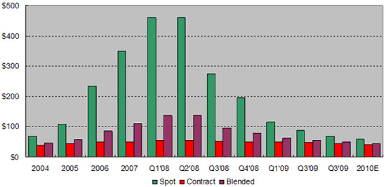 太陽能電池制造商把重點放在降低成本以維持一定獲利率的同時,也將持續(xù)推動電價往Grid Parity (太陽發(fā)電成本與傳統(tǒng)發(fā)電成本相當(dāng))的方向進(jìn)行。主要降低成本的方法包括使用較少的硅,或使用較便宜的硅。多晶硅(Polysilicon)是主要用于制造結(jié)晶硅(c-Si)太陽能電池的晶圓材料。而其占到整體太陽能模塊成本的15%到20%。由于大量多晶硅新產(chǎn)能的開出以及過去這一年的需求減少,硅晶的價格自2008年下半年起因供過于求而大幅下跌,目前雖然跌勢已經(jīng)趨緩,但預(yù)計2010年仍為供過于求的狀況,因此價格將持續(xù)下降。圖2為多晶硅價格趨勢。