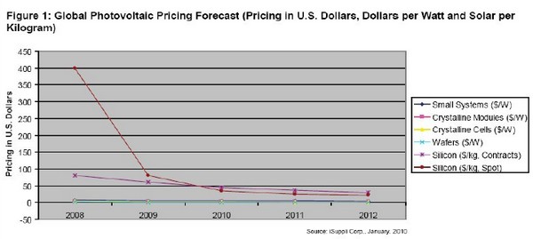 2009 年,光伏系統(tǒng)的平均價格下跌11%左右,而晶體硅組件的平均價格重挫了38%。iSuppli 公司預(yù)測,2010 年光伏系統(tǒng)的價格將下降10%,組件價格將再下跌20%。