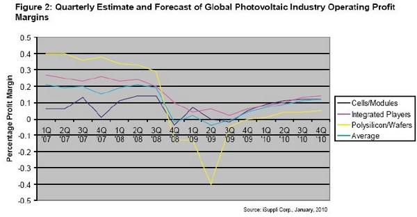 從多晶硅到組件,企業(yè)已通過閑置生產(chǎn)線和減少班次削減了產(chǎn)量。iSuppli 公司估計,2009 年所有節(jié)點(diǎn)的平均產(chǎn)能利用率為70%。有些企業(yè)全年產(chǎn)品脫銷,而有些企業(yè)則產(chǎn)品過剩。此外,2009 年許多廠商擴(kuò)充了產(chǎn)能。關(guān)于如何計算產(chǎn)量存在很大爭論, iSuppli 公司的定義是每周七天、每天24小時使用已安裝的生產(chǎn)線/設(shè)備。iSuppli 公司認(rèn)為,2010 年產(chǎn)能持續(xù)過剩或接近過剩將使價格持平。