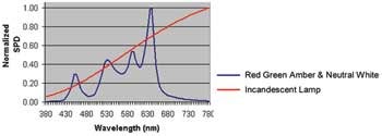多通道驅(qū)動(dòng)器:就給定的色溫而言,高質(zhì)量CRI(90以上)會(huì)需要多種類型的LED。CRI是光源的光譜能量分布(SPD)的一個(gè)函數(shù)。SPD是指給定波長(zhǎng)(頻率)下光源的輻射量。CRI數(shù)值表現(xiàn)最好(97以上)的白熾燈工作壽命較短(750~2500小時(shí)),效率也較低(美國(guó)能源部的數(shù)據(jù)為10~17Lm/W)。圖2顯示了白熾燈的SPD曲線與RGB光源曲線的對(duì)比情況。