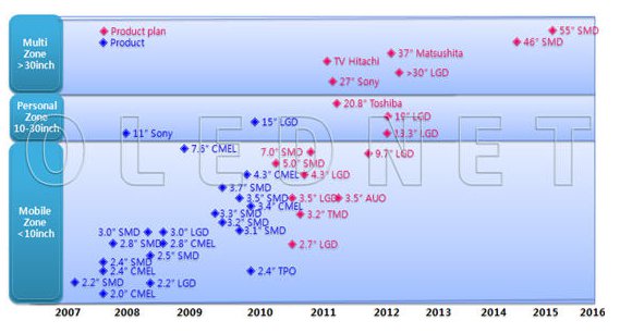 報(bào)告中還指出SMD將在2010年生產(chǎn)5.0英寸和7.0英寸的AMOLED面板。LG顯示器(LGD)將在2010年生產(chǎn)2.7英寸和4.3英寸AMOLED面板用于數(shù)碼相機(jī)和便攜電視,還將生產(chǎn)3.0英寸WQVGAAMOLED和3.5英寸WVGAAMOLED面板用于手機(jī)。日本東芝、松下和日立將于2011年推出20-40英寸的OLED電視面板。