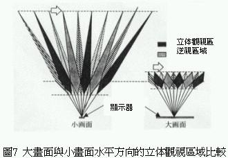 利用這種原理可以針對觀視者觀賞畫面時的最適當位置,除了提供觀視者左右兩眼影像之外,由影像正面的顯示區(qū)到最適距離所函蓋的區(qū)域,對觀視者而言就變成正常的立體三次元影像。不過兩眼視線相鄰處的影像,會被左、右兩眼在無意識狀態(tài)下捕捉讀取形成所謂的逆視領(lǐng)域,換句話說使用這種三維立體影像分割器的觀視者必需固定在一定的觀視位置才能產(chǎn)生立體視覺效果(圖2)。