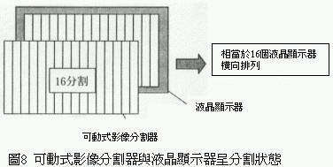 傳統(tǒng)的不需專用眼鏡的三維立體影像顯示器,同樣水平方向時小畫面的前后方向的立體可視范圍比大畫面的立體可視范圍大(圖7),這是因為小畫面的視角比較小,液晶顯示器與影像分割器較不容易產(chǎn)生所謂的moire干涉縞。利用這種物理現(xiàn)象將液晶顯示器與影像分割器,藉由電子方式分割成16等份各別掌控專屬區(qū)域(圖8)