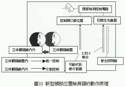 為了改善上述缺失因此開發(fā)出頭部檢測系統(tǒng)(headtrackingsystem),利用這種檢測系統(tǒng)可隨時偵測觀視者頭部位置,一旦產(chǎn)生逆視領(lǐng)域時顯示器會立即切換左右兩眼所讀取的影像,如此一來不但可以防止逆視問題的發(fā)生,還可以擴大三次元立體影像的可觀視范圍.