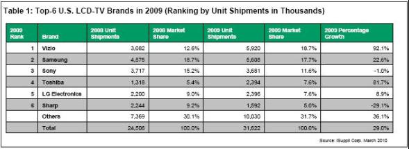 據(jù)iSuppli公司,Vizio在2009年成為美國市場(chǎng)的領(lǐng)先液晶電視品牌,而三星電子則在總體平板電視市場(chǎng)排名第一。