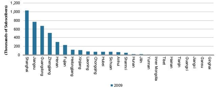 IPTV服務(wù)目前已擴展到中國的20多個省市,但IPTV用戶只集中在少數(shù)幾個地區(qū)。在中國的22個省中,IPTV用戶超過10萬的不到八個。而且,全部IPTV用戶中有整整56%只集中在三個地區(qū):中國最大城市上海,以及人口密集的東部省份江蘇和南部省份廣東。