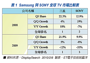 根據DisplaySearch研究指出,2009第三季全球電視品牌出貨金額排名與市佔率,三星皆為第一名,遠勝暫居第三的SONY(見圖一),但是就三星現階段的作法來看,三星似乎不滿足,對於OLED TV與3DTV等產品線,三星集團早已極積佈局。而就2010的CES展來看,三星推出65吋的3DTV,其中內建3D處理器,可將2D內容轉換成3D,同時,三星也會推出藍光播放機,同時支援3D內容播放。