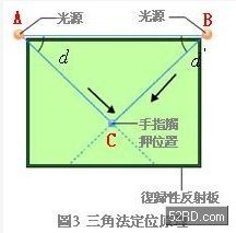 大型觸控面板採(cǎi)「光線遮蔽方式」,圖3是光學(xué)式大型觸控面板應(yīng)用三角法定位原理的動(dòng)作原理,如圖所示,若知道A-B之間的距離、A點(diǎn)的夾角d,以及B點(diǎn)的夾角,就能夠確定C點(diǎn)的位置,A-B之間的距離為已知數(shù),只要確定A點(diǎn)的夾角與B點(diǎn)的夾角即可。