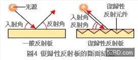 此時(shí)若在顯示器周圍設(shè)置復(fù)數(shù)個(gè)收光器,勢(shì)必會(huì)造成觸控面板制作成本暴增,有鑑于此,研究人員在顯示器周圍黏貼「復(fù)歸性反射板(ReturnReflectorSheet)」,它可以反射來(lái)自顯示器周圍任何方向的光線,亦即從感測(cè)器射出的任何光線都會(huì)折返至感測(cè)器,如果被筆或是手指遮蔽時(shí),光線就不會(huì)折返至感測(cè)器(圖4)。