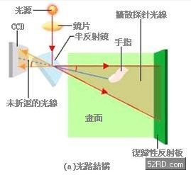 雖然傳統(tǒng)阻抗式薄膜觸控面板結(jié)構(gòu)簡(jiǎn)單、制作成本低廉,不過(guò)透明觸控薄膜經(jīng)常曝露在刮傷、破損的操作環(huán)境下。整體來(lái)看,使用容易、不需特殊操作工具、不需黏貼特殊膜片,成為新世代多媒體平臺(tái)用大型觸控面板的必備條件,因此研究人員決定採(cǎi)用光學(xué)方式,具體結(jié)構(gòu)是讓雷射二極體的光線在畫(huà)面上通行,依此檢測(cè)筆或是手指觸壓位置(座標(biāo)軸)。光學(xué)方式可以分為「檢測(cè)光線反射位置」以及「檢測(cè)光線被遮蔽位置」這兩種方式。