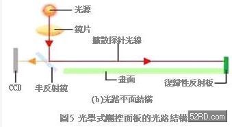 圖5是光學(xué)式觸控面板的光路結(jié)構(gòu),由圖可知,若掌握無(wú)法折返光線的角度,理論上就可以輕易求得使用者觸押面板的位置。