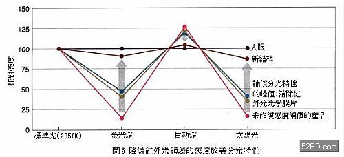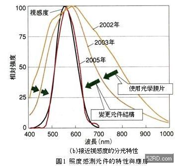 如圖6所示,分光特性可透過照度感測元件結(jié)構(gòu)上的改良獲得調(diào)整,基本上它是改變的接合位置(吸光產(chǎn)生電力),同時(shí)配合分光特性的峰值利用光學(xué)濾光片(filter)去除紫外光與紅外光。新日本無線根據(jù)上述動(dòng)作原理進(jìn)行分光特性最佳化設(shè)計(jì),再以光罩(mask)遮斷從光二極管側(cè)面入射的光線,藉此捨棄光學(xué)濾光片傳統(tǒng)結(jié)構(gòu);德國OSRAM則採用新材質(zhì)與新結(jié)構(gòu),未使用傳統(tǒng)的改善對策,大幅提升照度感測元件的分光特性。