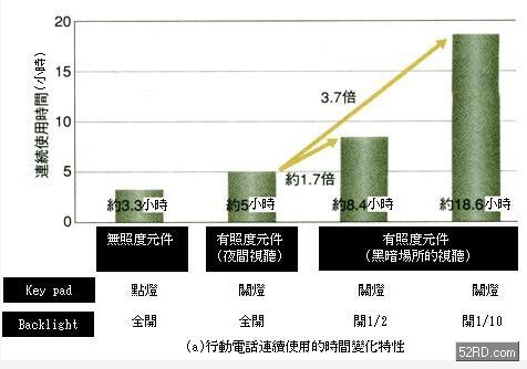 如圖2所示,照度感測元件具備感測夜間戶外只有(Lux;照度單位),乃至于晴天戶外亮度超過的特性,換句話說若能充分應(yīng)用上述特性并作精密控制,理論上可以徹底解決各種電子設(shè)備因光源造成的影像不良等問題。例如照度感測元件可以隨時(shí)偵測周圍環(huán)境的光量多寡,自動(dòng)調(diào)整背光模阻的點(diǎn)燈狀況,進(jìn)而有效降低可攜式電子產(chǎn)品的電池消費(fèi)電力(耗電量),同時(shí)延長通話與待機(jī)時(shí)間與電池的使用壽命(圖3(a))。