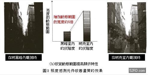 有關(guān)液晶電視的應(yīng)用,主要是液晶顯示器的點(diǎn)燈時(shí)間越久消費(fèi)電力就越大,相對的散熱處理與散熱風(fēng)扇的噪音則變成非常棘手的問題,尤其是目前大型液晶電視的輝度大多超過時(shí),在明亮室內(nèi)畫面非常的亮麗,不過在黑暗室內(nèi)卻會出現(xiàn)波紋現(xiàn)象,而且畫面太亮容易造成眼睛疲勞,黑暗色影像的黑色浮動(dòng)現(xiàn)象非常明顯,影像對比則大幅降低。由于一般液晶電視是根據(jù)各畫素的液晶穿透率,調(diào)整背光模組的光線達(dá)成灰階化顯示目的,然而過多的背光模組光量卻有漏光之虞,如果利用照度感測元件偵測液晶電視視聽環(huán)境的亮度,依此調(diào)整背光模組的輝度,除了影像黑色浮動(dòng)之外,灰階數(shù)相同的條件下還可以縮小亮度的動(dòng)態(tài)范圍(dynamicrange),進(jìn)而提高黑色影像表現(xiàn)能力(圖3(b)),并降低最大輝度解除影像太亮的困擾,這意味著觀賞液晶電視時(shí),消費(fèi)者不會受到視聽環(huán)境的影響,隨時(shí)可以獲得細(xì)膩的影像。