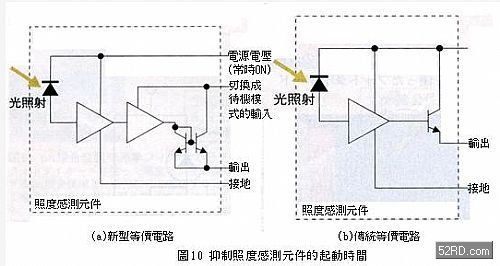 由于照度感測元件受光時(shí)會消耗電力,因此利用電池驅(qū)動(dòng)的電子設(shè)備,尤其是可攜式電子產(chǎn)品為抑制電池的消耗電力,所以大多採用間斷式驅(qū)動(dòng)照度感測元件,然而照度感測元件的電源電壓頻繁的ON/OFF動(dòng)作,對PhotoIC而言起動(dòng)時(shí)間最少需要,這段期間卻形成所謂的「電力損失」,因此東芝公司針對上述問題,常時(shí)對增幅電路施加電壓,同時(shí)在增幅電路后段設(shè)置切換電路(圖10),試圖藉此電路縮短起動(dòng)時(shí)間并降低消耗電力,根據(jù)測試結(jié)果顯示消耗電力是傳統(tǒng)元件一半以下。
