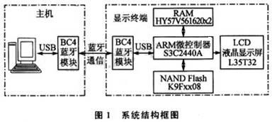 顯示終端由以ARM9微控制器S3C2440A為核心的嵌入式Linux平臺加上BlueCore4藍牙模塊以及LCD液晶顯示屏組成。Linux操作系統(tǒng)安裝在NANDFLASH中,并連接了64MB的外擴RAM。由于S3C2440A接口比較豐富,所以系統(tǒng)硬件具有較好的擴展性能。