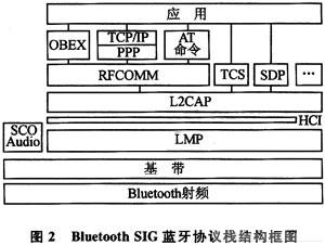 系統(tǒng)通過藍牙協(xié)議棧的RFCOMM協(xié)議層進行通信。RFCOMM協(xié)議提供串行數(shù)據(jù)傳輸,并能在2臺藍牙設(shè)備之間同時維持多達60個連接,可以同時支持遺留串行端口應(yīng)用程序以及其他應(yīng)用程序中的OBEX協(xié)議。藍牙協(xié)議棧的結(jié)構(gòu)框圖如圖2所示。