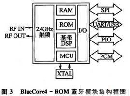 主機端和顯示終端都使用了CSR公司BlueCore4-ROM芯片組成的藍牙無線收發(fā)模塊。BlueCore4系列符合2.0版藍牙標準,并與現(xiàn)有1.1版和1.2版藍牙設(shè)備完全兼容。這里采用的BlueCore4-ROM芯片具有很高的集成度,需要很少的外圍露件。它提供了UART、USB2.0等主機接口,并且提供了PCM音頻接口以及SPI接口。具有支持微微網(wǎng)和散射網(wǎng),低功耗,和手機良好兼容,可以和802.11協(xié)議共存等優(yōu)點。BlueCore4藍牙模塊結(jié)構(gòu)如圖3所示。