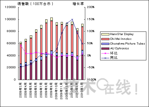 2010年3月臺灣四家大型液晶面板廠商的銷售額環(huán)比增加了9%。2010年3月18日由臺灣群創(chuàng)光電(Innolux Display)、原奇美電子(ChiMei Optoelectronics)和統(tǒng)寶光電(TPO Displays)合并成立的臺灣奇美電子(Chimei Innolux,CMI)3月份的銷售額不包括原奇美電子和統(tǒng)寶光電3月1日~3月17日的銷售額。如果加上這部分銷售額的話,預(yù)計(jì)四大廠商的合計(jì)銷售額將環(huán)比增加25%左右。