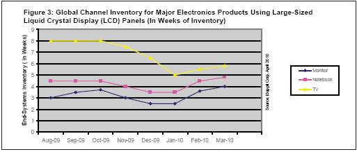 圖3所示為iSuppli公司對(duì)大尺寸LCD應(yīng)用的全球渠道庫(kù)存估測(cè)。iSuppli公司定義的大尺寸LCD面板是對(duì)角尺寸大于等于10英寸的面板。