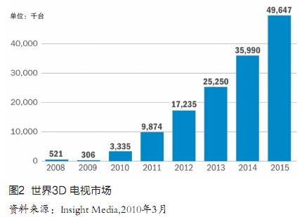 Insight Media市場(chǎng)研究公司3月發(fā)表的最新報(bào)告更加樂觀,預(yù)測(cè)世界3D電視市場(chǎng)將從今年的340萬(wàn)臺(tái)飚升到2015年的4965萬(wàn)臺(tái),增長(zhǎng)10倍還多(圖2),屆時(shí)占有率將超過(guò)20%。其對(duì)手公司iSupp1i公司尤其樂觀,認(rèn)為同期世界3D電視市場(chǎng)將從420萬(wàn)臺(tái)竄升到7800萬(wàn)臺(tái),占有率達(dá)40%,銷售額644億美元。