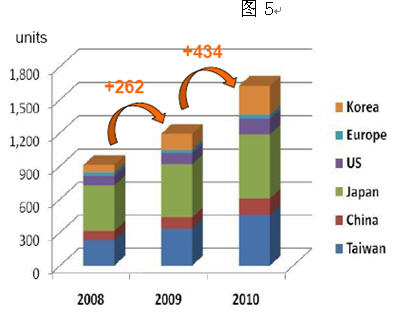 晶粒方面,預(yù)估全球MOCVD數(shù)量逐步增加(圖5),其中以韓國和臺灣廠商最為積極,Samsung, LG Innotek以及AUO旗下的Lextar都將增加MOCVD機臺數(shù)量至目前的2~3倍。到2010年底,預(yù)計全球高亮度LED晶粒月產(chǎn)能將接近200億,但目前市場應(yīng)用仍以移動終端產(chǎn)品和汽車照明用為主,前兩者的應(yīng)用比重高達55%,但TV用背光源應(yīng)用比重總體仍將難突破20%,因此背光源缺貨狀況的緩解將需要較長時間。