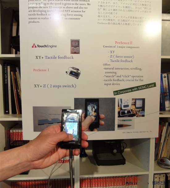 該感壓面板不但能夠偵測到施加到平面方向(X軸、Y軸)的壓力,垂直于該平面的Z軸方向壓力也可偵測到。索尼CSL將該面板集成到了索愛手機(jī)上進(jìn)行演示。根據(jù)演示,手機(jī)上的圖標(biāo)轉(zhuǎn)換速度根據(jù)觸摸壓力的不同進(jìn)行變化,壓力愈大,轉(zhuǎn)換速度就越快。
