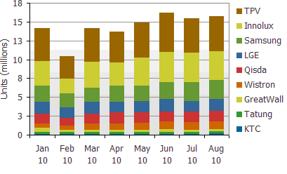 圖二: 2010年1月到8月全球前九大液晶顯示器代工廠生產(chǎn)計劃