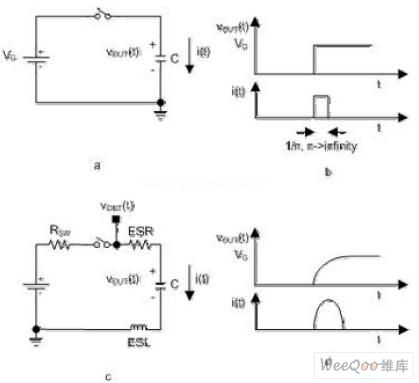圖1︰從一個電壓源對電容進行充電(圖a和b是理想情況,c和d是實際情況)。