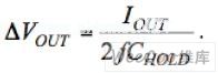 在第二階段,C1+連接到輸出,放電電流(電流大小與前面的充電電流相同)通過C1流到負載。在這個階段,輸出電容電流的變化大約為2IOUT。盡管這個電流變化應(yīng)該能產(chǎn)生一個輸出電壓變化為2IOUTESRC_HOLD,使用低ESR的陶瓷電容使得這種變化可以忽略不計。此時,CHOLD按下面的電量線性電位充電︰