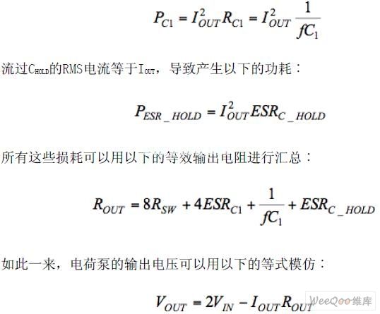 除了這些純粹的電阻損耗,IOUT的RMS電流流過開關(guān)電容C1的等效電阻,產(chǎn)生的功耗為總之,因為陶瓷電容低的ESR以及高的開關(guān)頻率,輸出漣波以及輸出電壓降取決于開關(guān)電阻。