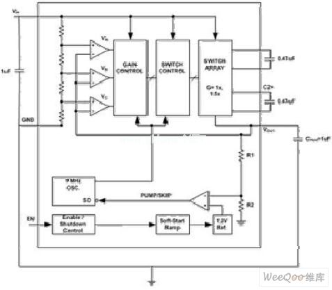 下調(diào)的輸出電壓通過PUMP/SKIP比較器與1.2V的電壓基準比較。PUMP/SKIP比較器輸出電壓在啟動時線性上升,提供軟啟動功能。當輸出電壓超過期望的極限,器件不會開啟,消耗的電源電流將很小。在這種空閑狀態(tài)的期間,輸出電容CHOLD提供輸出負載電流。隨著這個電容不斷放電以及輸出電壓降低到期望的輸出電壓以下,電荷泵被激活直到輸出電壓再次達到高于這個值。